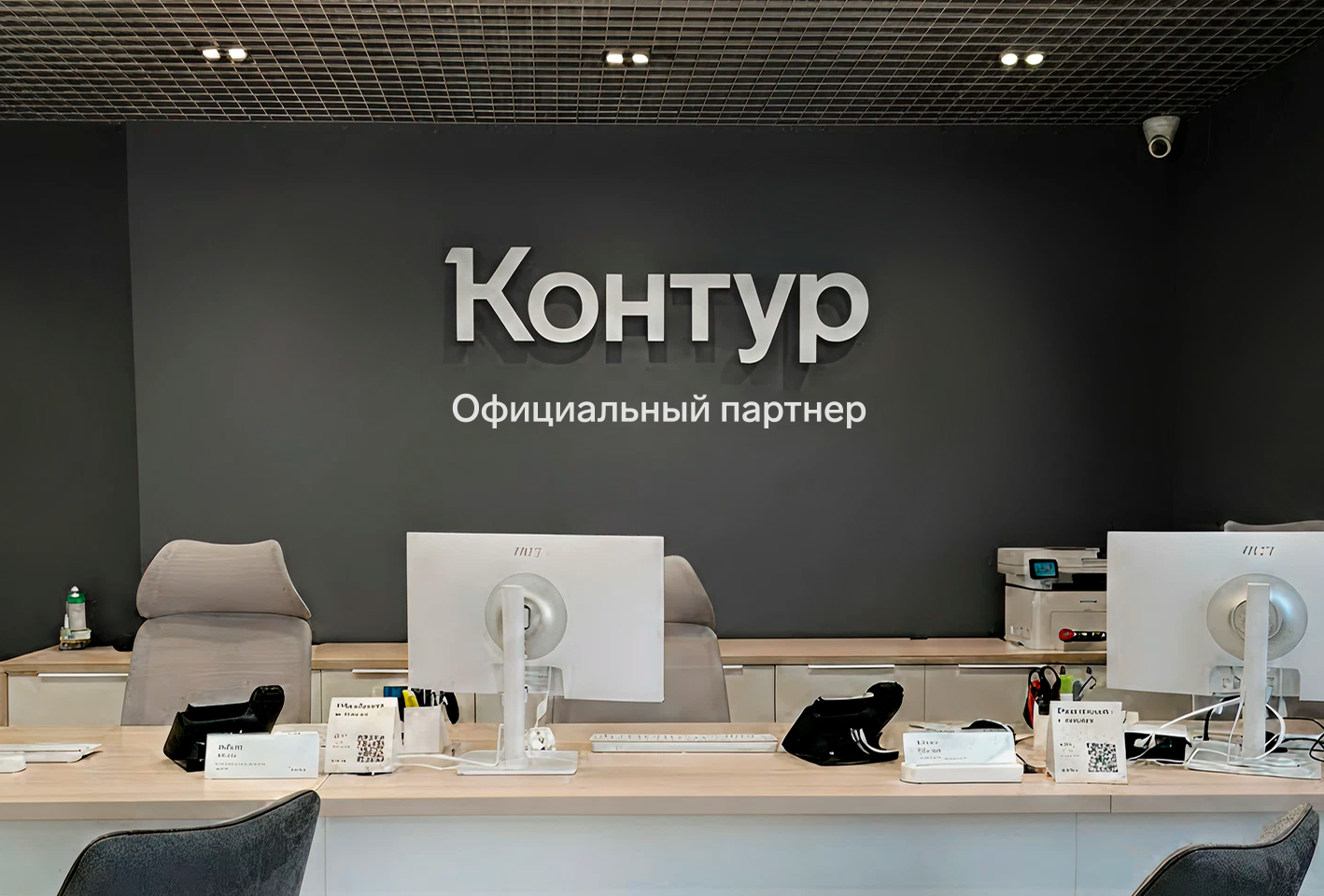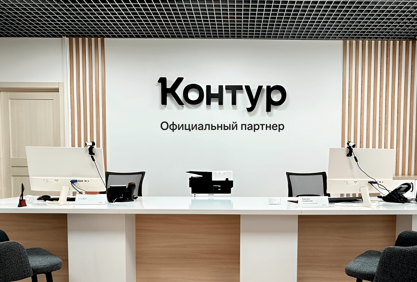 При разработке интерьерной вывески необходимо подумать о связанности наружней вывески и внутренней. Между ними не должно быть противоречий. Интерьерная вывеска «Контур» — отдельные объемные буквы черного цвета на однотонной светлой стене без подложки. Дескриптор «Официальный партнер» размещается под основной вывеской — плоские буквы черного цвета. Вывеску и дескриптор изготавливаем из пластика или акрилового стекла с оклейкой матовой пленкой, размещаем в клиентских зонах или лифтовых холлах перед входом в офис продаж.