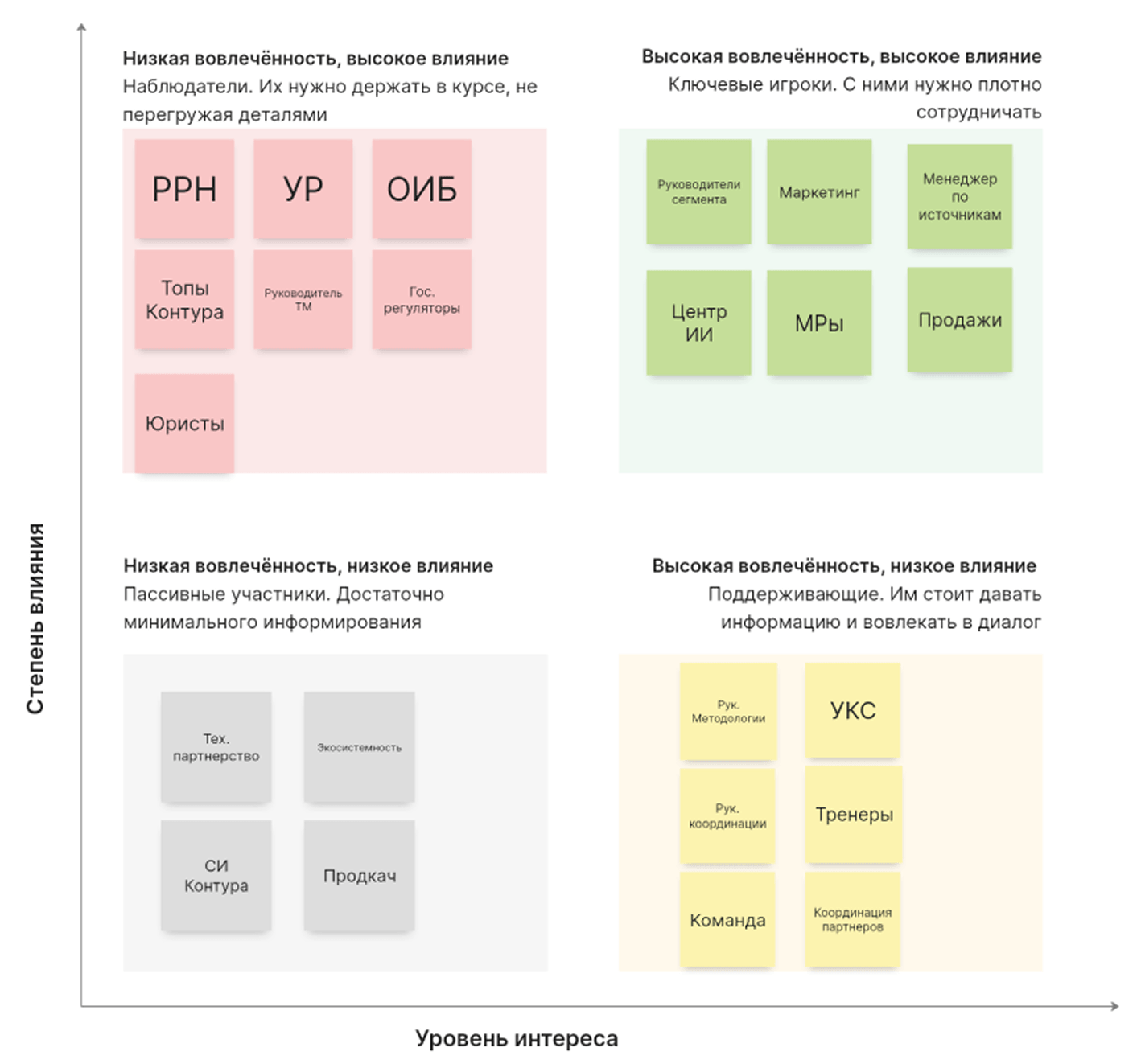 От них зависит стратегия и бюджет. Сюда относим: Руководителей сегмента, Маркетинг, Продажи, Менеджеров проектов и команду разработки. - «Поддерживающие игроки» (Высокий интерес и низкое влияние)